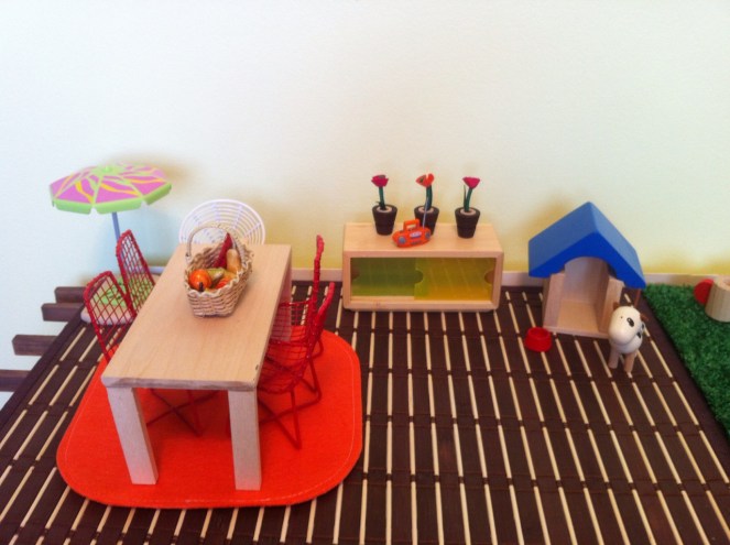 I talked with Sara about her dollhouse and we are thinking of adding another shoe rack. It would have a large bedroom for all the kids and a dream playroom. With just two play sets to buy this should not be that expensive. Of course I would do the lighting in better way, already built into the ceiling.